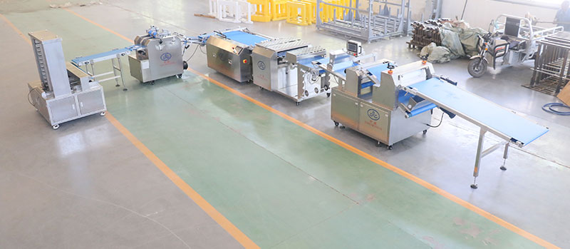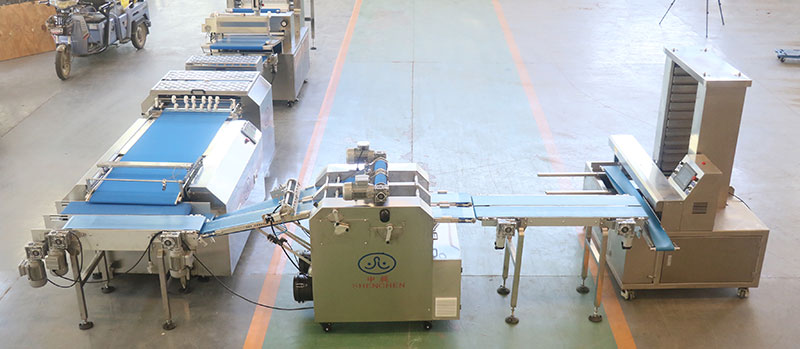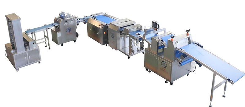 Esta línea de producción de croissants está compuesta por una laminadora de masa de dos rodillos, una cortadora de lámina de masa, un alineador y dosificador de masa, una banda transportadora divergente de doble capa, una máquina formadora y enrolladora de croissants de doble carril, una banda transportadora de alineación (queuing conveyor) y, de manera opcional, una máquina automática de acomodado de bandejas.