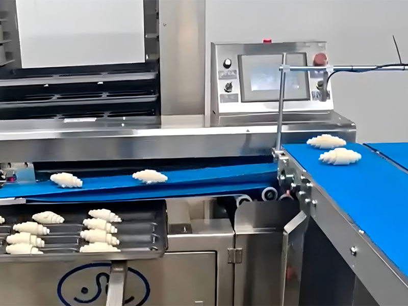 Los croissants terminados se colocan automáticamente sobre bandejas de horneado, reduciendo la manipulación manual y mejorando la continuidad del flujo de trabajo entre las diferentes etapas del proceso.