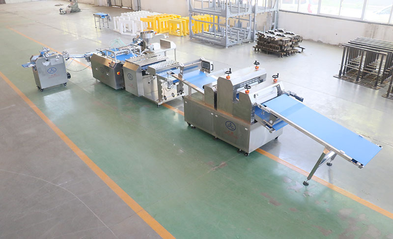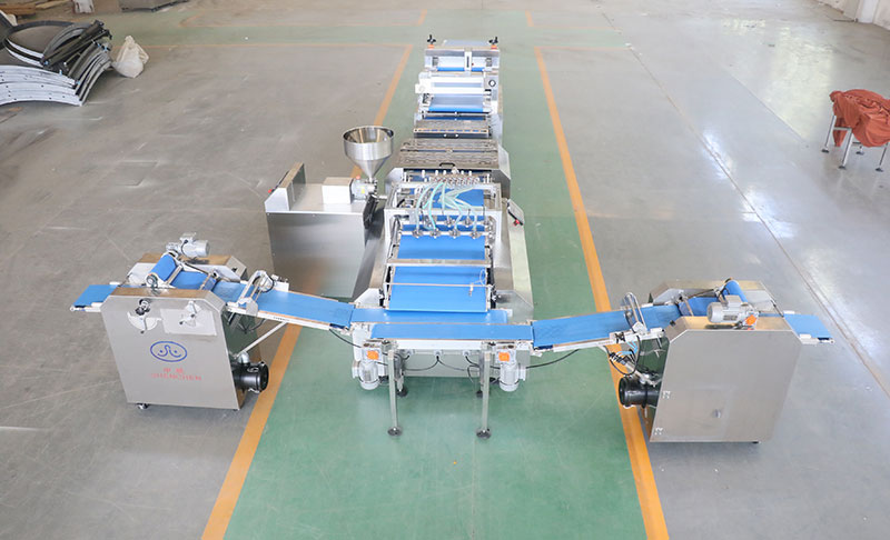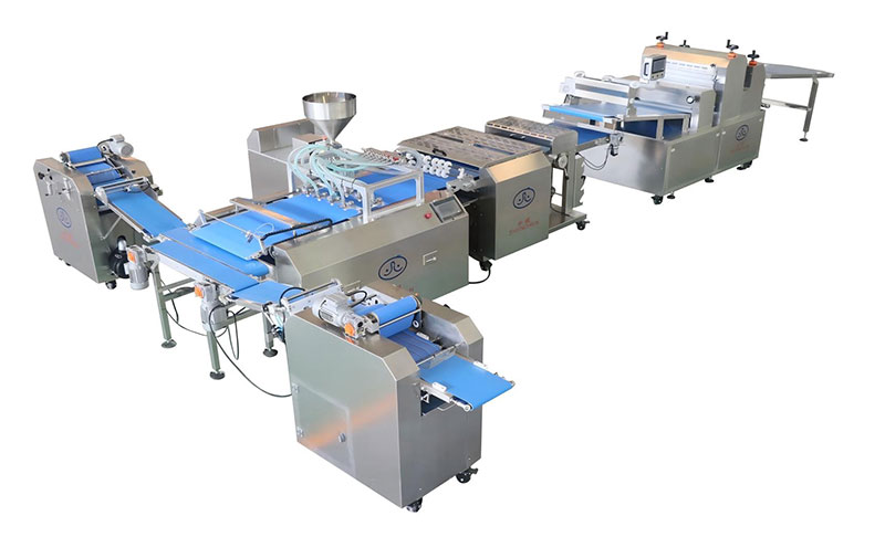 La línea está compuesta por una laminadora de masa de múltiples rodillos, una cortadora de lámina de masa, un alineador y dosificador de masa, una unidad de relleno sincronizado, una banda transportadora divergente izquierda, derecha y dos máquinas formadoras y enrolladoras de croissants.