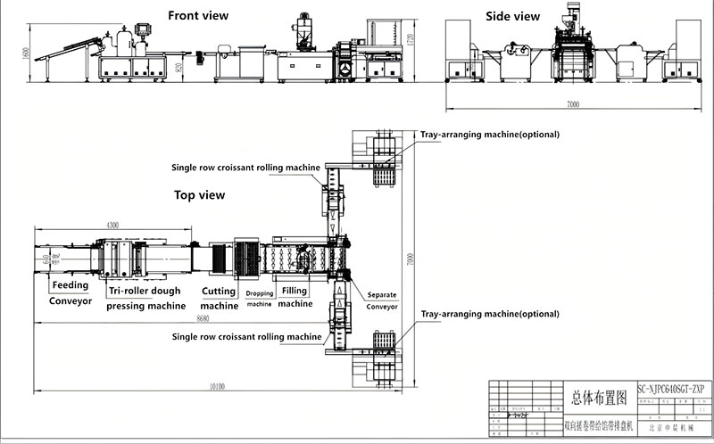 Esta línea automática de producción de croissants incorpora el proceso de relleno dentro de la fabricación y está compuesta por una laminadora de masa de tres rodillos, una cortadora de lámina de masa, un alineador y dosificador de masa, una máquina automática de relleno en línea, una banda transportadora divergente izquierda–derecha y dos máquinas formadoras y enrolladoras de croissants. La línea ofrece como opción un sistema de relleno fijo y cuenta con un dispositivo de corte por hilo de acero en la salida para evitar que el relleno forme hilos. El tamaño y la posición de las boquillas de relleno pueden ajustarse mediante el cambio de la placa de boquillas.