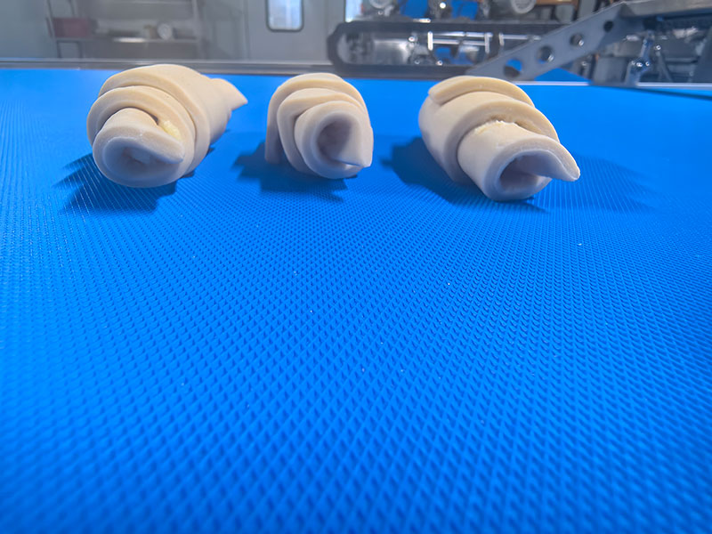 Producción por hora (con relleno): 70 g: aproximadamente 4,000 unidades; 50 g: aproximadamente 5,000 unidades; Rendimiento ≥95%. (No se recomienda producir croissants con relleno menores a 40 g en esta línea.)